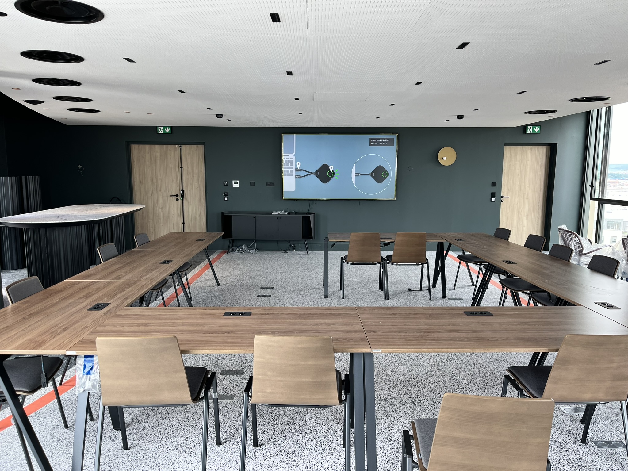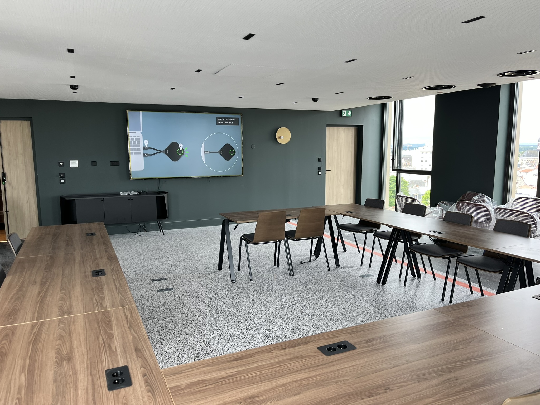 L’objectif était d’offrir aux clients et organisateurs d’événements une expérience haut de gamme, combinant image grand format, partage sans fil fluide et son immersif dans toute la pièce, le tout parfaitement intégré à l’architecture du lieu.
